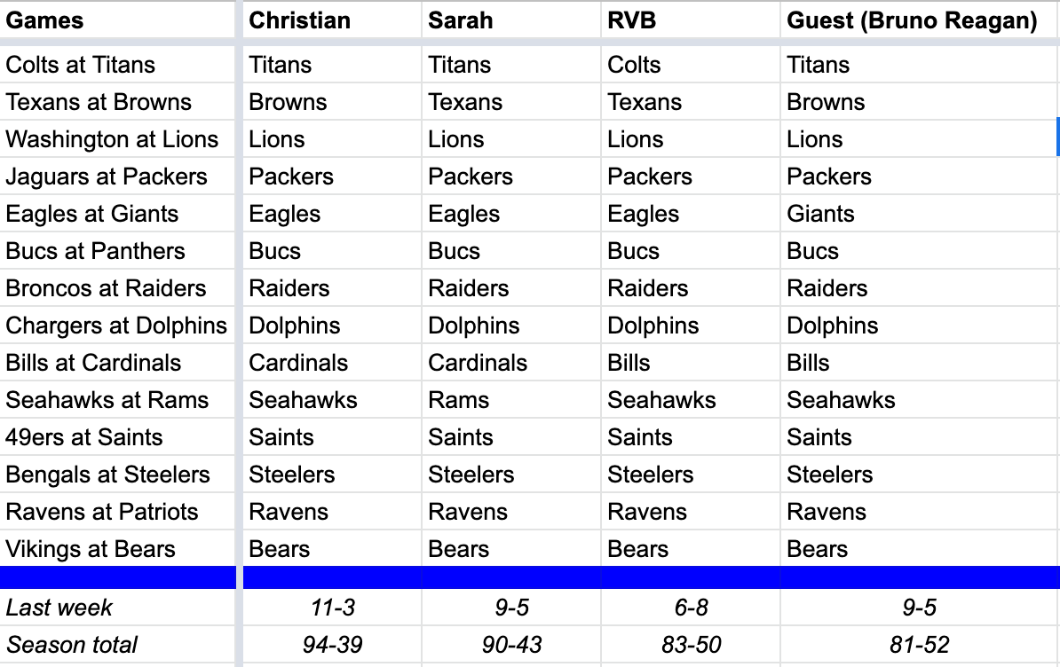 Because our panel is composed of four sentient beings, we all picked the Dolphins to win this one. Yeah, Miami is actually kind of good this year, but this has more to do with the Chargers being unable and unwilling to win.